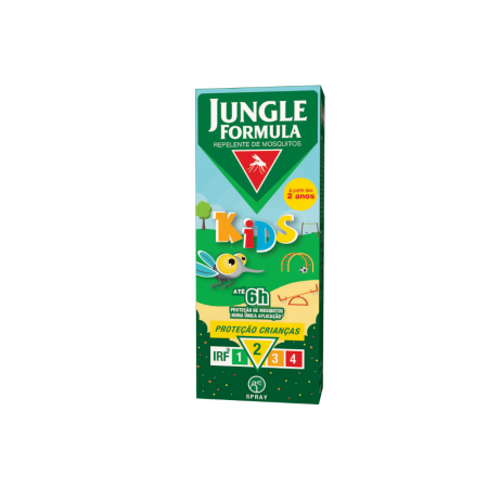 Jungle Formula Kids com 9,5% DEET, adequado para crianças entre os 2 e 12 anos para uma proteção até 6h contra mosquitos.