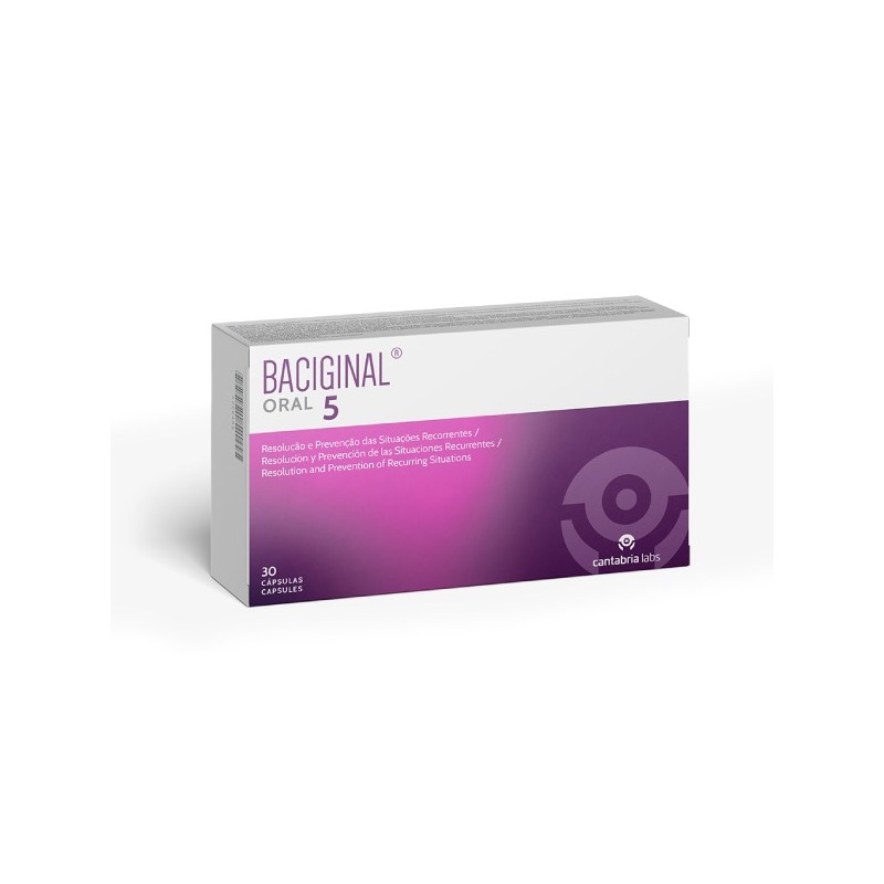 Baciginal Oral 5 é um suplemento alimentar que constitui uma fórmula reforçada com 5 estirpes específicas: Lactobacillus gasseri LG050, Lactobacillus acidophilus LA14, Lactobacillus plantarum LP080, Lactobacillus casei subsp. rhamnosus LRH020 e Bifidobacterium lactis BL050. Contém Ácido Fólico e Vitamina D, que contribuem para o normal funcionamento do sistema imunitário.