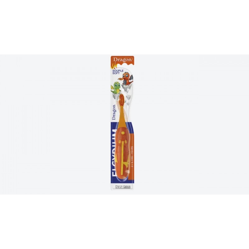 Uma escova de dentes em forma de dragão para encorajar as crianças com idades compreendidas entre os 2 e os 6 anos a escovar os dentes.