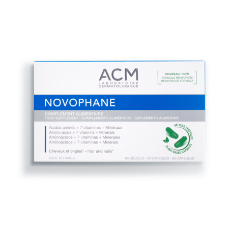 As cápsulas reforçadas de Novophane contêm uma fórmula muito completa com aminoácidos sulfurados, vitaminas e oligoelementos para manter as unhas e cabelos saudáveis.